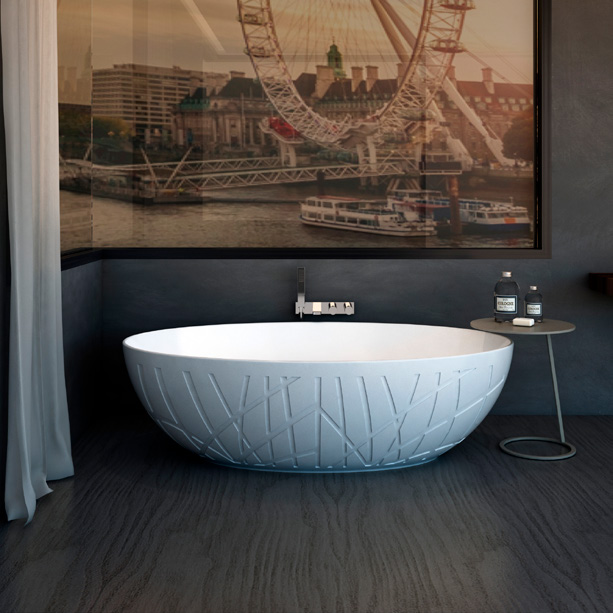 This set of solid surface tubs and sinks with a branch texture look is perfect for modern hotel bathroom décor.