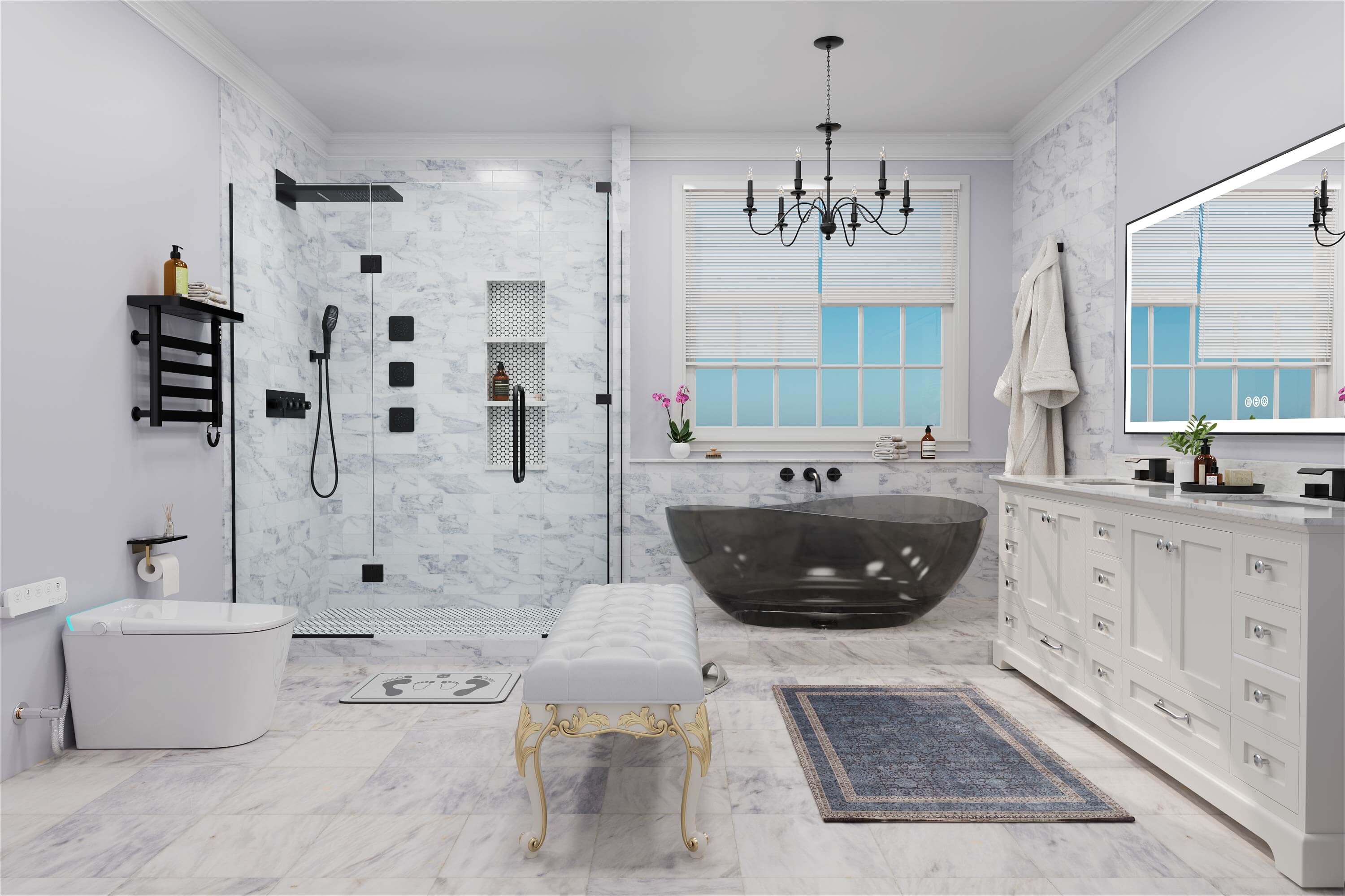 This gold retro bathroom furniture set shows classic luxury and is suitable for bathroom spaces larger than 200 square feet. The set includes a 69-inch stone resin bathtub, a brushed gold freestanding faucet, a 72-inch retro bathroom vanity, two mirrors with gold frames, two brushed gold sink faucets, a premium egg-shaped smart toilet, a brushed gold shower system and six bathroom hardware sets.