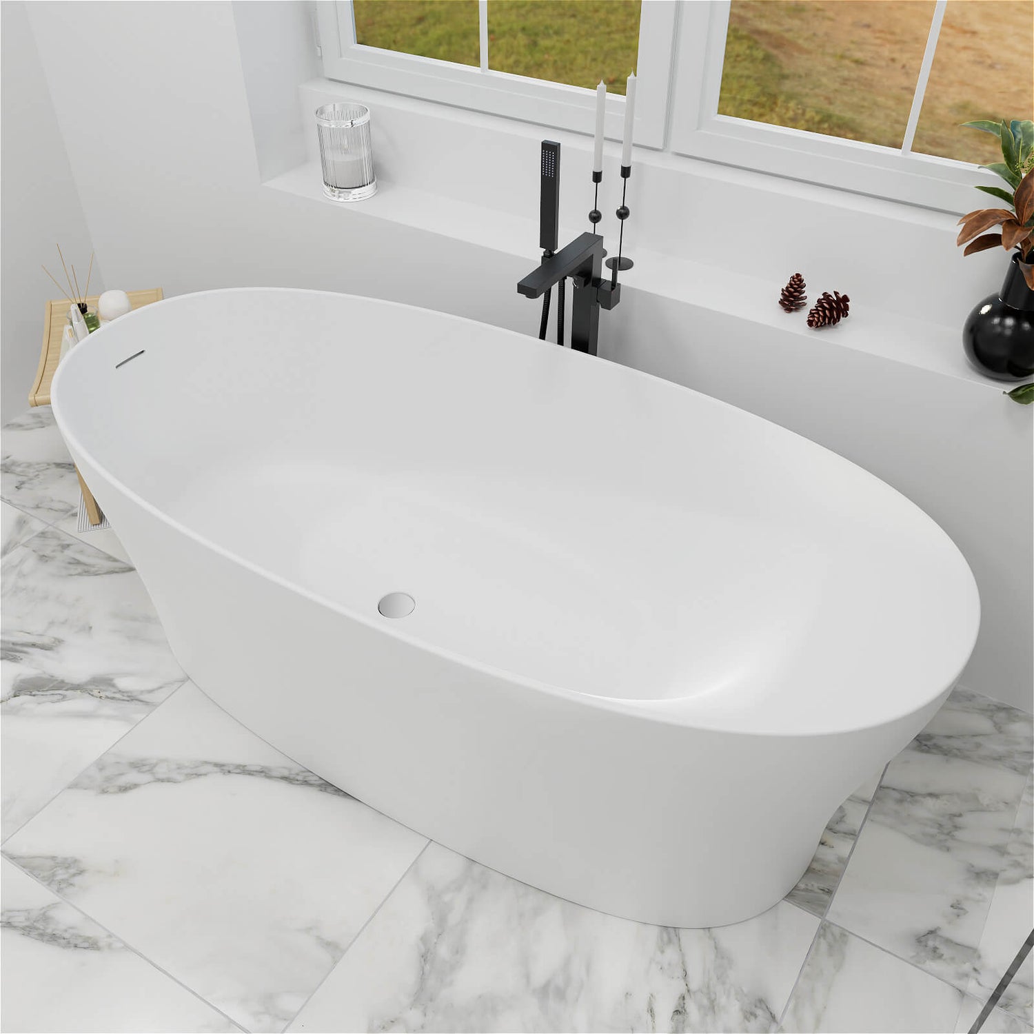 65" Stone Resin Bathtub Oval-shaped Solid Surface Stand Alone Tub with Pop-up Drain
