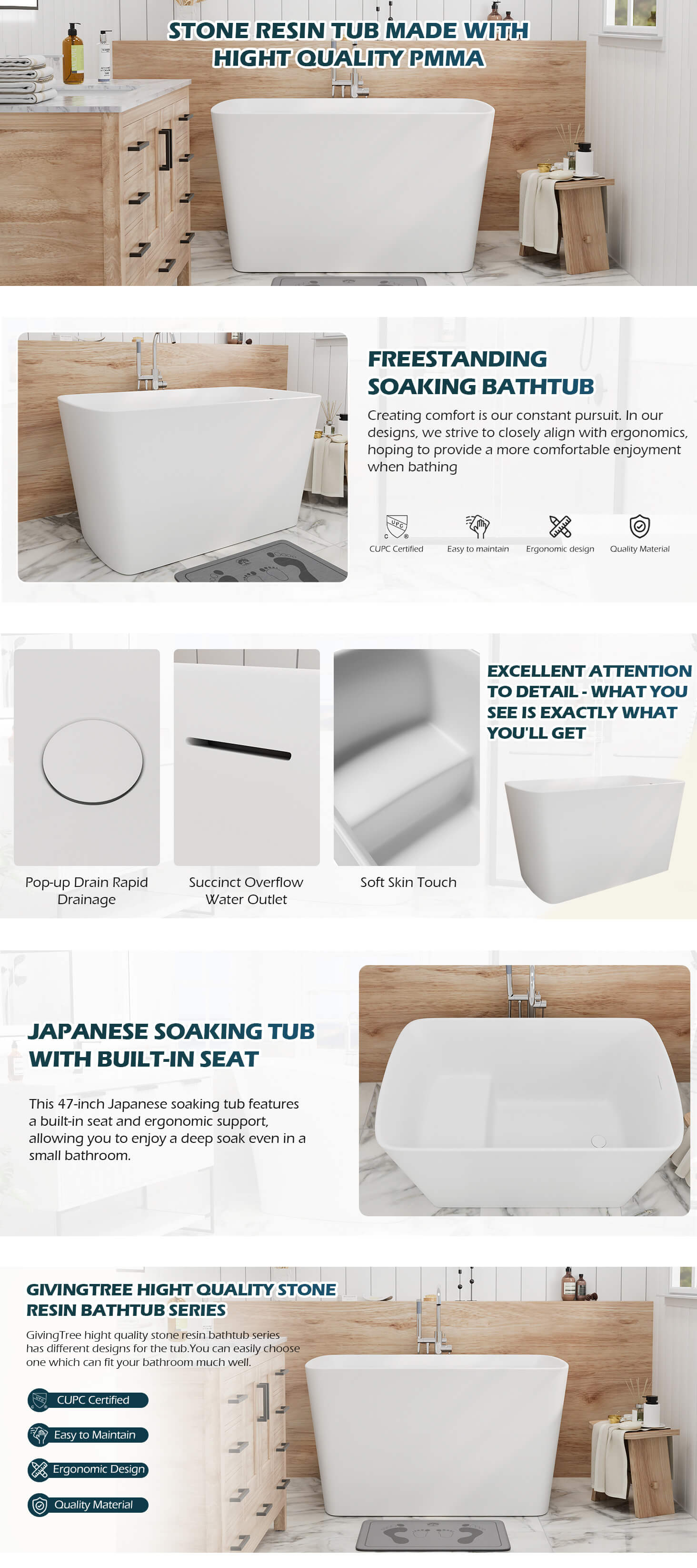 - 【Japanese Style】: If you have a love for Japanese culture, this 47'' Japanese tub with a seat is definitely the best choice. Inspired by Japanese bathing culture, it exudes luxury in a subtle manner.