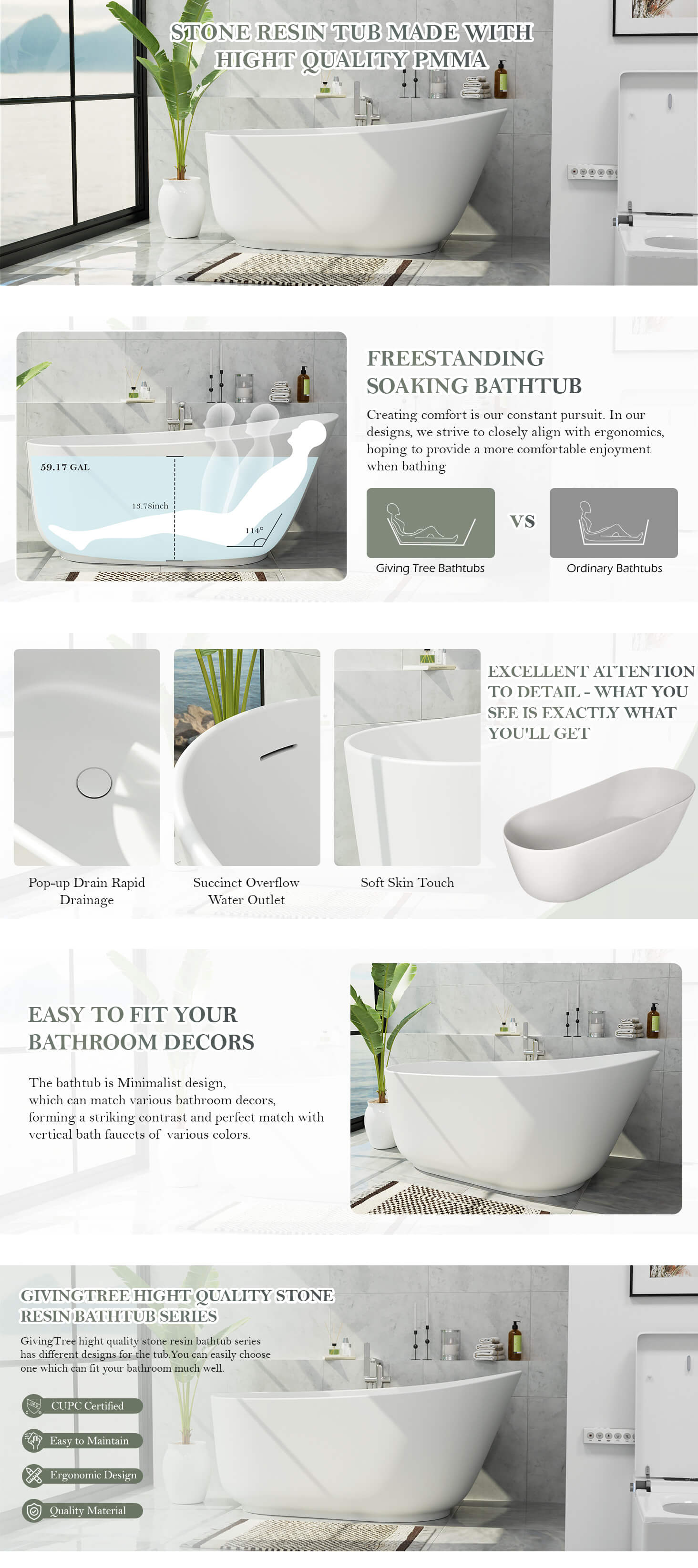 - REPAIRABLE: The stone resin bathtub material is repairable and can be restored with sandpaper if scratches are caused by accidental impacts during daily use.