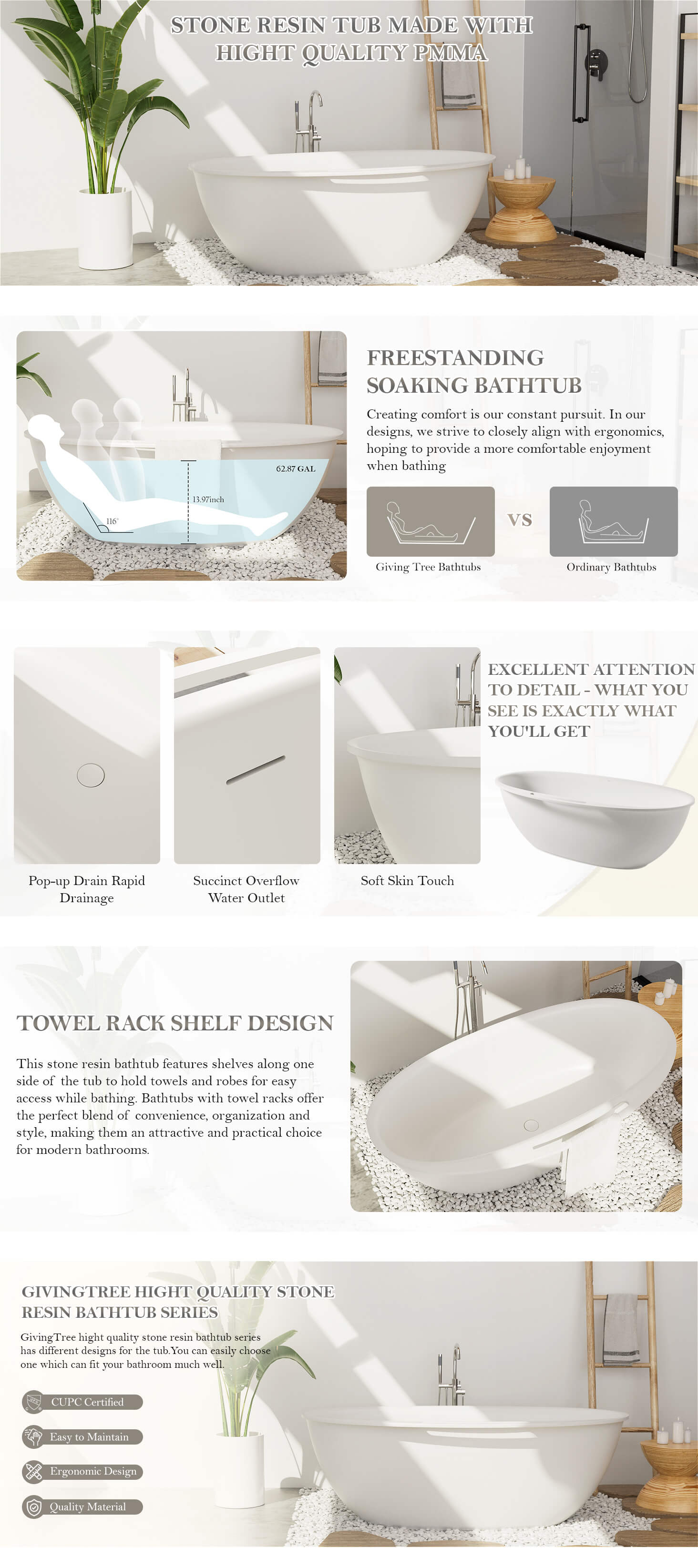 - 【Easy to Clean】A notable advantage of solid surface stone resin is its durability, antibacterial properties, and ease of cleaning. A simple wipe is all it takes to make the bathtub look like new again.