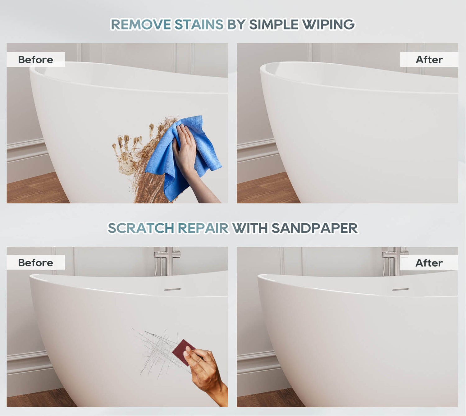 The stone resin bathtub is durable and repairable. Even if it is accidentally worn, it can be restored by sanding it with sandpaper. It will not fade after long-term use and is easy to clean. If there are stains, just wipe it with a rag.