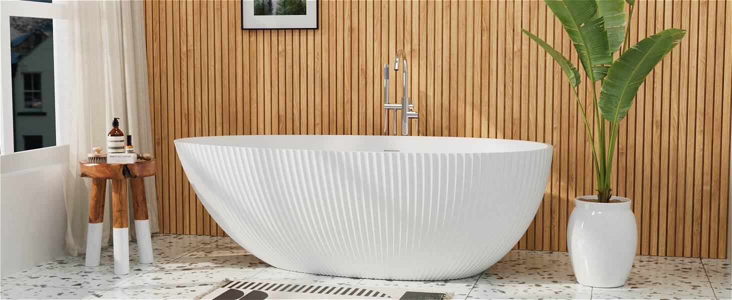 The G8-1071W67 bathtub features a meticulously designed exterior surface, crafted through multiple rounds of polishing to create a distinctive textured effect. Each raised line extends gracefully from the top to the bottom, with evenly spaced intervals, exuding a dynamic and artistic charm. Its design resembles a stunning piece of decorative art, making it an excellent choice for both home and commercial spaces, where it effortlessly enhances visual appeal and artistic sophistication.