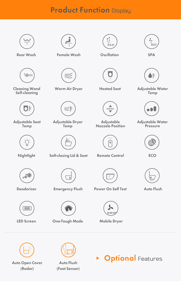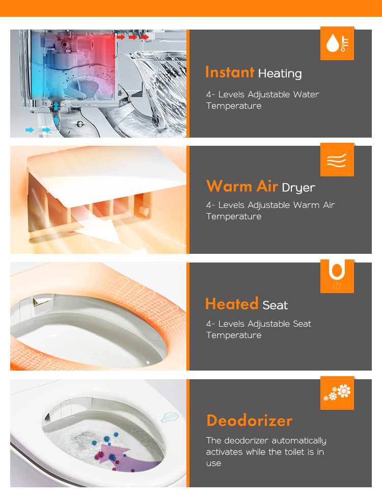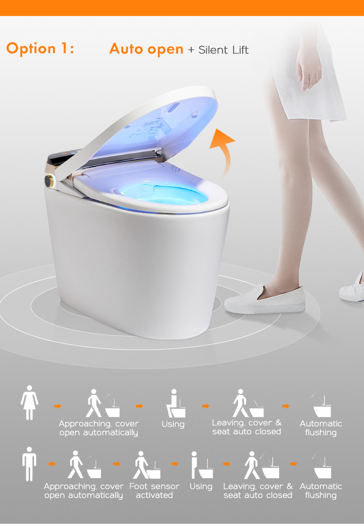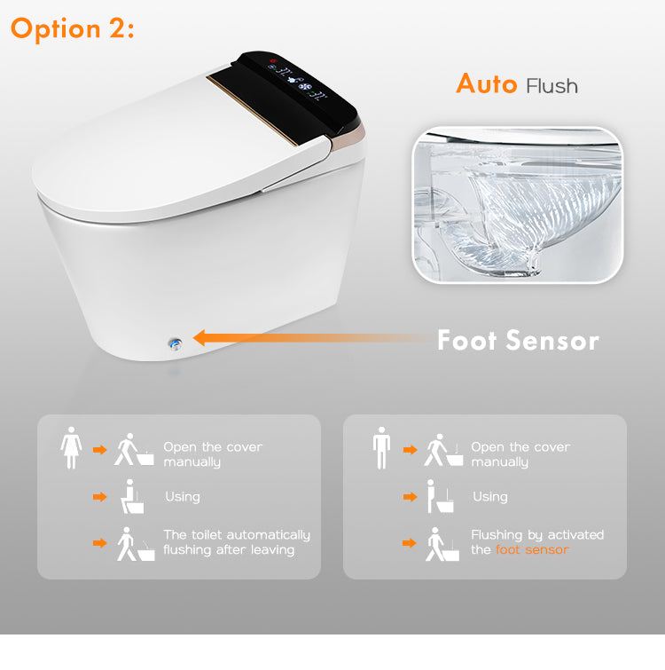 - Auto Flushing: Foot kick automatic flushing, close the lid automatic flushing, but also add deodorant, automatic deodorization. Constant pressure flushing has high stability, strong flushing force and good effect. The flushing noise is lower than that of pulse type, The water consumption for flushing is only 1.27GPF.