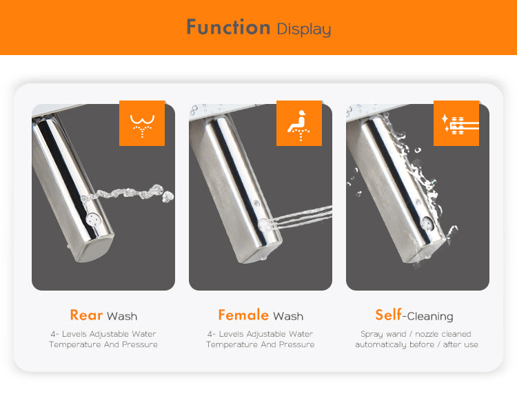 - Automatic Cleaning Spray Wand: 2 dedicated adjustable spray outlet for rear wash and female wash. Automatic pre- and post-rinsing of spray nozzle with fresh water.