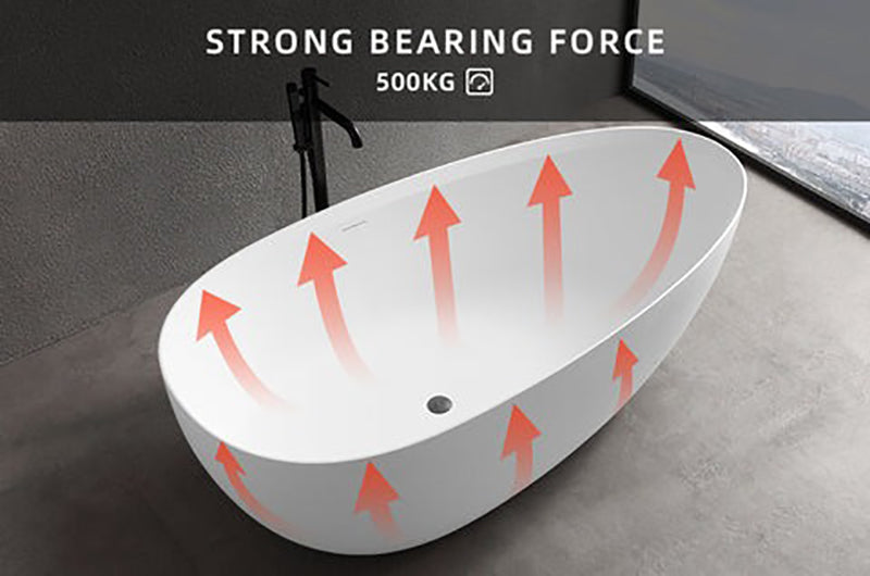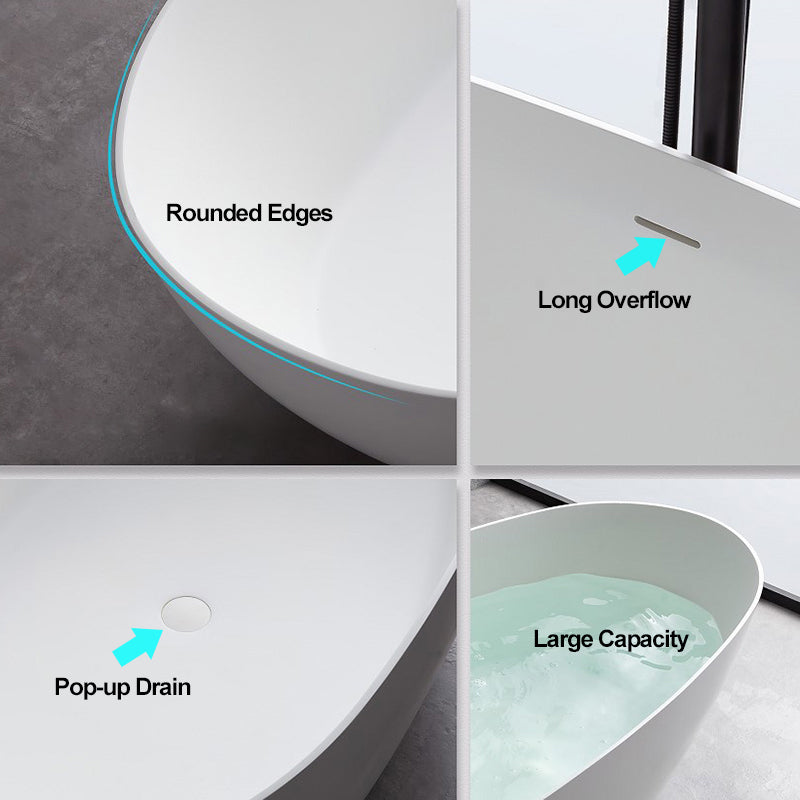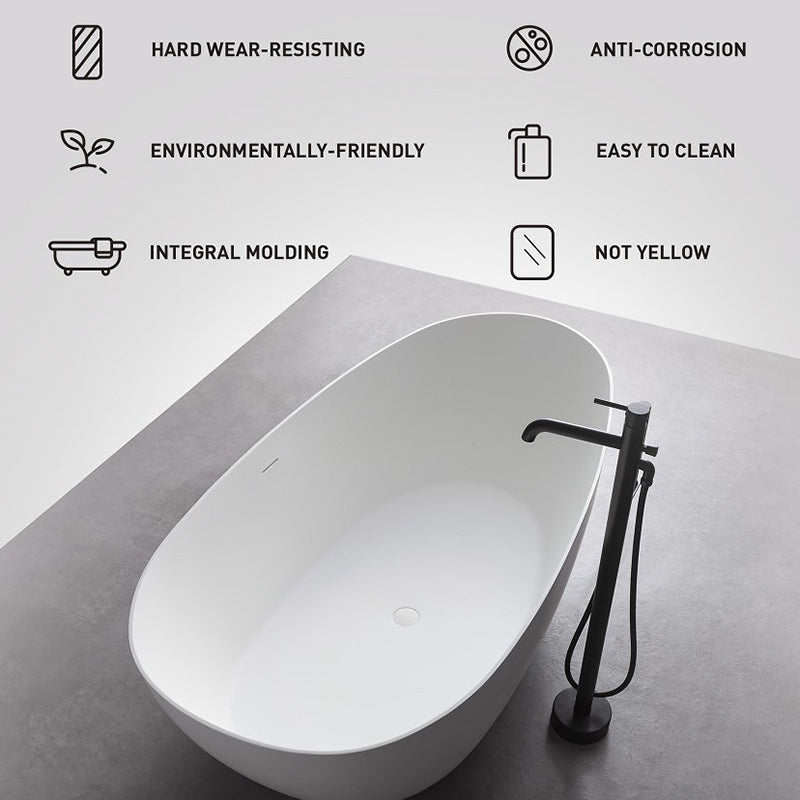 This oval-shaped solid surface bathtub is round and smooth with modern charm. Blending functionality and style, this bathtub transforms your bathroom into an area of modern luxury. The freestanding bathtub faucet will perfectly match with matte white finish, complementing for your spa-like soaking experience.