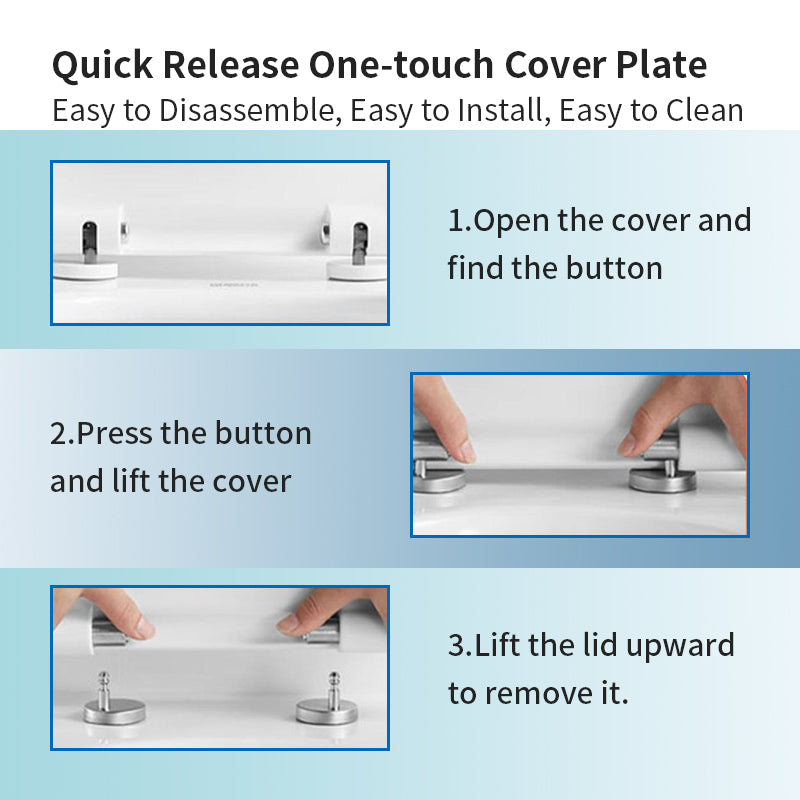 With a siphon jet doule flush fully skirted drain, this toilet offers a sleek, eye-catching, seamless design that is easier to clean. The small size is suitable for small bathrooms. The pipes are 360° glazed with large eddy current openings for unobstructed flow and prevent clogging.Quick-release matte chrome hinges allow the seat to be unlatched from the toilet for easy removal and convenient cleaning, no tools required.
