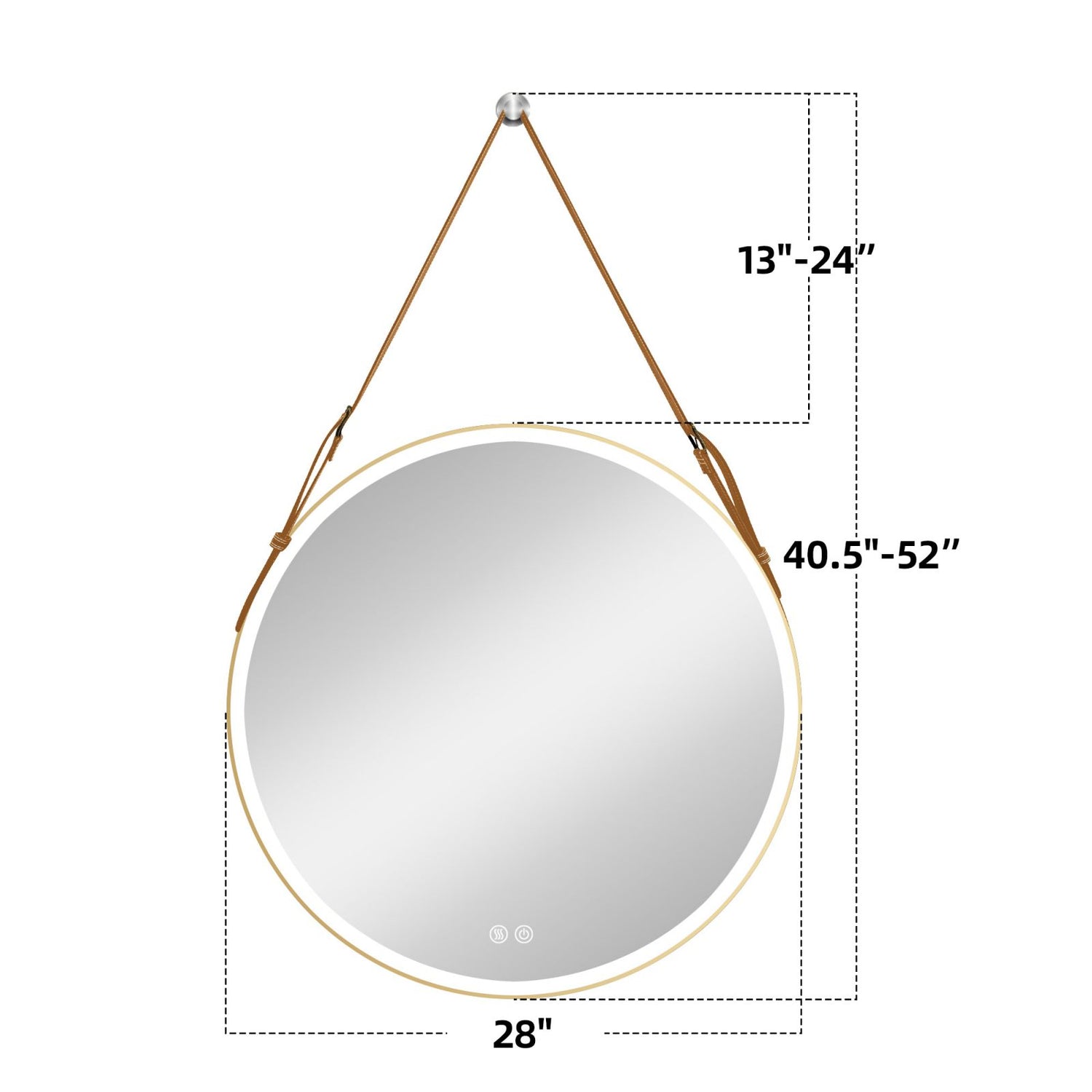 28" & 32" Hanging bathroom mirrors feature high-definition, eco-friendly, copper-free silver glass, a 1.6-inch gold metal frame, and a high-quality PU belt. The dimmable LED backlit mirror offers adjustable color temperatures from 3000K to 6500K. It includes smart multifunctionality with separate controls for lighting and defogging and easy installation with a 63-inch power plug. The mirror comes in sturdy packaging to ensure safe delivery.
